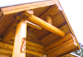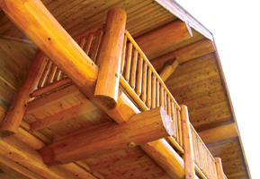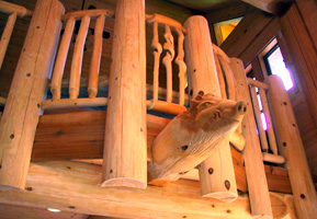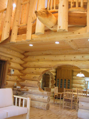 目の詰んだ最高級のウェスタンレッドシーダー材の骨太丸太による重量感と玄関ポーチ柱のウサギやリビング吹抜けのイノシシのカービングと妻壁や破風のレッドシーダーログパネルなどで正統派のログハウスです。